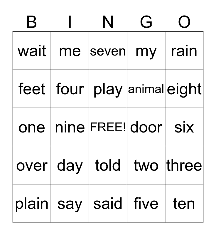 This bingo card has a free space and 24 words: day, say, play, plain, rain, wait, feet, me, door, told, animal, one, two, three, four, five, six, seven, eight, nine, ten, over, my and said.
