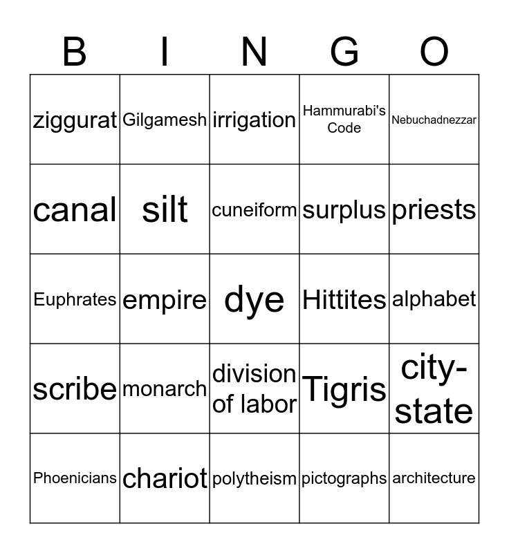 This bingo card has a free space and 28 words: city-state, epic, surplus, pictographs, canal, irrigation, Gilgamesh, scribe, Hittites, Phoenicians, Euphrates, Hammurabi's Code, chariot, polytheism, priests, social hierarchy, monarch, silt, cuneiform, division of labor, ziggurat, Sargon, architecture, empire, alphabet, Tigris, Nebuchadnezzar and Assyrians.