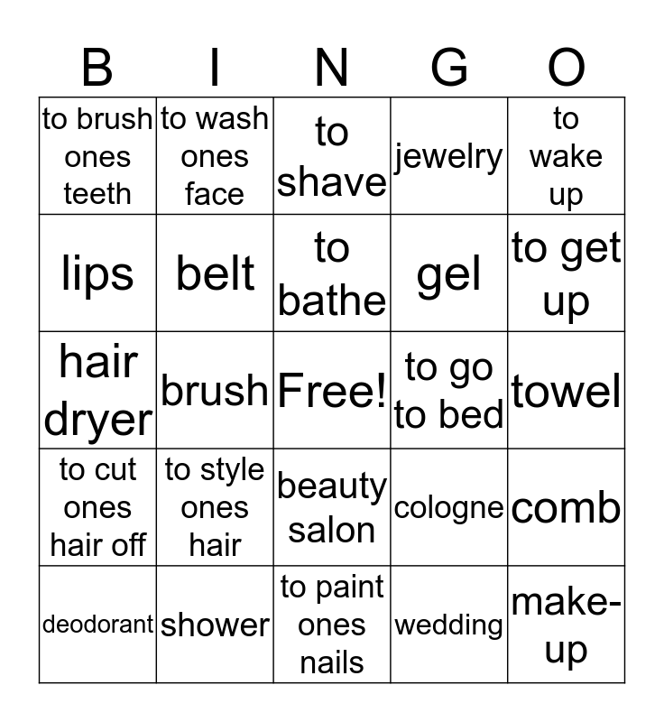 This bingo card has a free space and 24 words: to style ones hair, shower, to bathe, deodorant, to wake up, to brush ones teeth, lips, to wash ones face, to go to bed, beauty salon, gel, hair dryer, cologne, comb, belt, wedding, towel, to shave, to get up, brush, make-up, to cut ones hair off, jewelry and to paint ones nails.