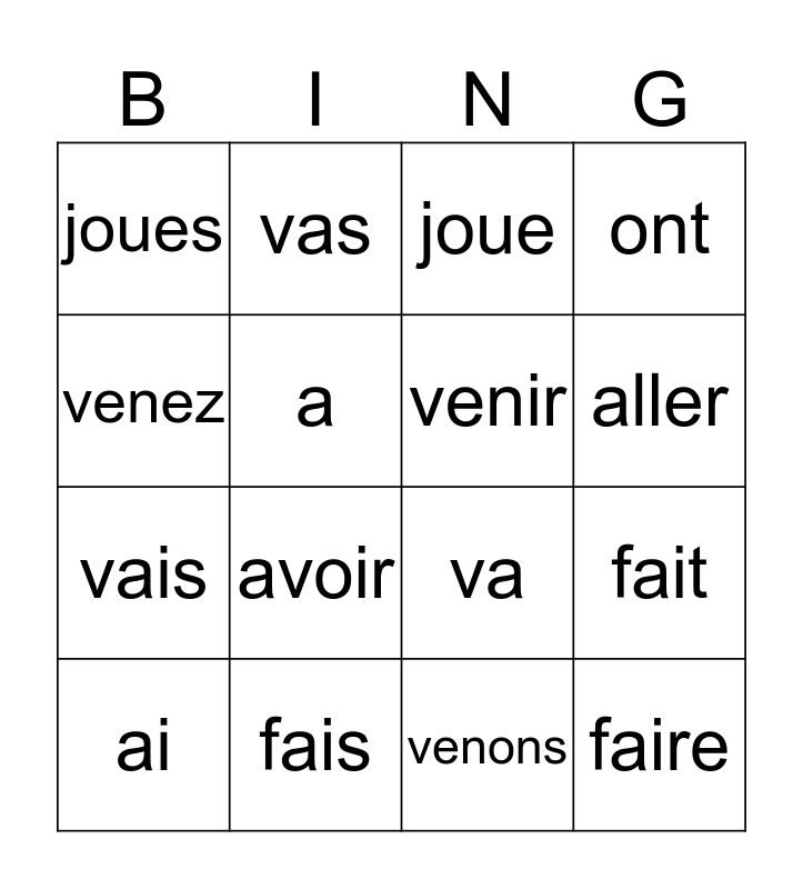 This bingo card has 16 words: fais, fait, joue, joues, vais, vas, va, venons, venez, a, ai, ont, avoir, aller, venir and faire.