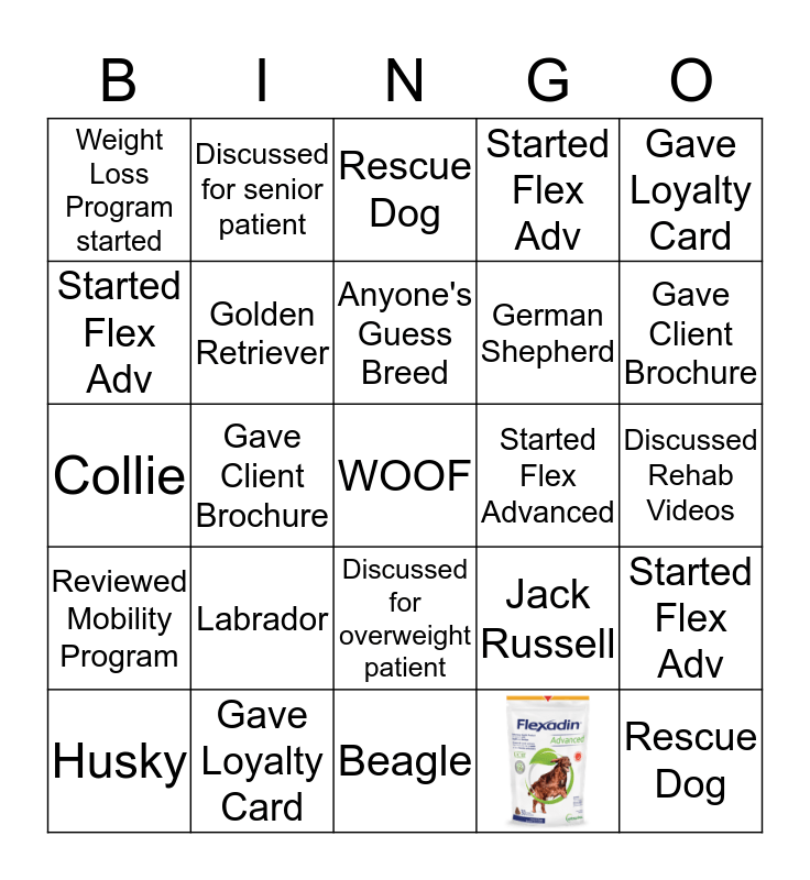 This bingo card has 1 images, a free space and 24 words: Labrador, Beagle, Anyone's Guess Breed, Husky, Gave Loyalty Card, Weight Loss Program started, Started Flex Adv, Discussed for senior patient, Started Flex Advanced, Discussed for overweight patient, German Shepherd, Collie, Jack Russell, Started Flex Adv, Golden Retriever, Started Flex Adv, Discussed Rehab Videos, Rescue Dog, Gave Client Brochure, Gave Client Brochure, Rescue Dog, Gave Loyalty Card, Reviewed Mobility Program and Started Flex Adv.
