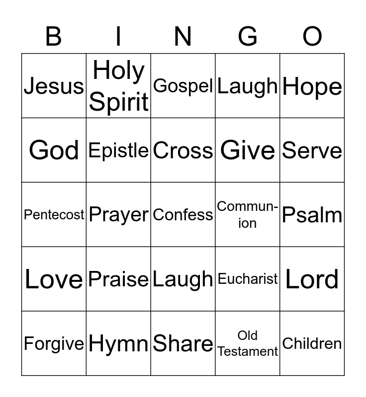 This bingo card has a free space and 24 words: Praise, Hymn, Cross, Forgive, Hope, Jesus, God, Holy Spirit, Commun- ion, Laugh, Give, Pentecost, Eucharist, Lord, Epistle, Old Testament, Psalm, Gospel, Serve, Prayer, Children, Love, Laugh and Share.