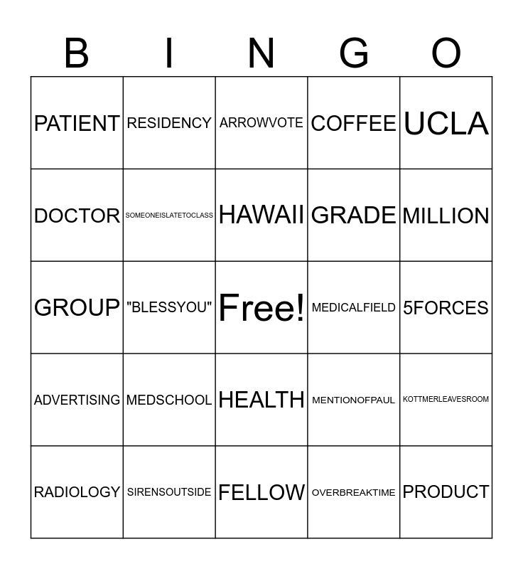 This bingo card has a free space and 25 words: MEDSCHOOL, FELLOW, HAWAII, RADIOLOGY, UCLA, PATIENT, DOCTOR, RESIDENCY, MEDICALFIELD, HEALTH, GRADE, GROUP, MENTIONOFPAUL, KOTTMERLEAVESROOM, SOMEONEISLATETOCLASS, SODACANOPENS, 5FORCES, ARROWVOTE, MILLION, "BLESSYOU", PRODUCT, SIRENSOUTSIDE, ADVERTISING, COFFEE and OVERBREAKTIME.