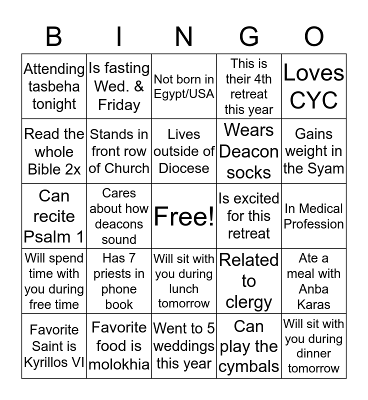 This bingo card has a free space and 24 words: Has 7 priests in phone book, Favorite food is molokhia, Lives outside of Diocese, Favorite Saint is Kyrillos VI, Loves CYC, Attending tasbeha tonight, Read the whole Bible 2x, Is fasting Wed. & Friday, Is excited for this retreat, Will sit with you during lunch tomorrow, Wears Deacon socks, Can recite Psalm 1, Related to clergy, Ate a meal with Anba Karas, Stands in front row of Church, Can play the cymbals, In Medical Profession, Not born in Egypt/USA, Gains weight in the Syam, Cares about how deacons sound, Will sit with you during dinner tomorrow, Will spend time with you during free time, This is their 4th retreat this year and Went to 5 weddings this year.