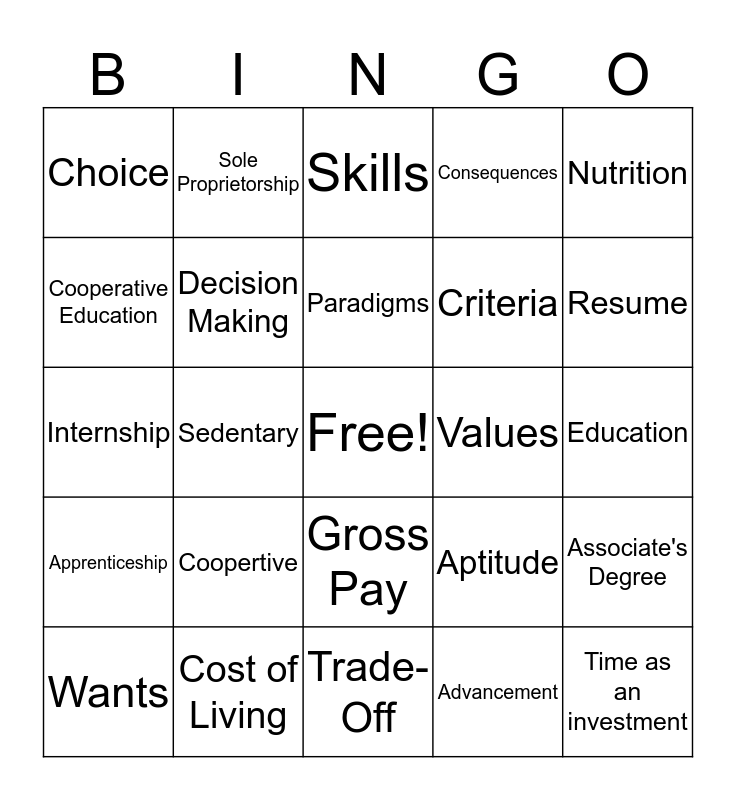 This bingo card has a free space and 55 words: Needs, Wants, Scarcity, Choice, Trade-Off, Opportunity Cost, Decision Making, Alternatives, Criteria, Cost/Benefit, Consequences, Everyday Living, Time Management, Goals, Health, Moderation, Nutrition, Sedentary, Stress, Time as an investment, Values, Abilities, Aptitude, Skills, Standard of Living, Paradigms, Advancement, Career Ladder/Career Path, Education, Associate's Degree, Bachelor's Degree, Community College, College, University, Cooperative Education, Internship, Occupational Training Programs, Apprenticeship, Grants and Scholarships, Student Loan, Sole Proprietorship, Partnership, Corporation, Franchise, Coopertive, Cost of Living, Job, Entry Level, Cover Letter, Resume, Benefits, Income, Salary, Gross Pay and Net Pay.