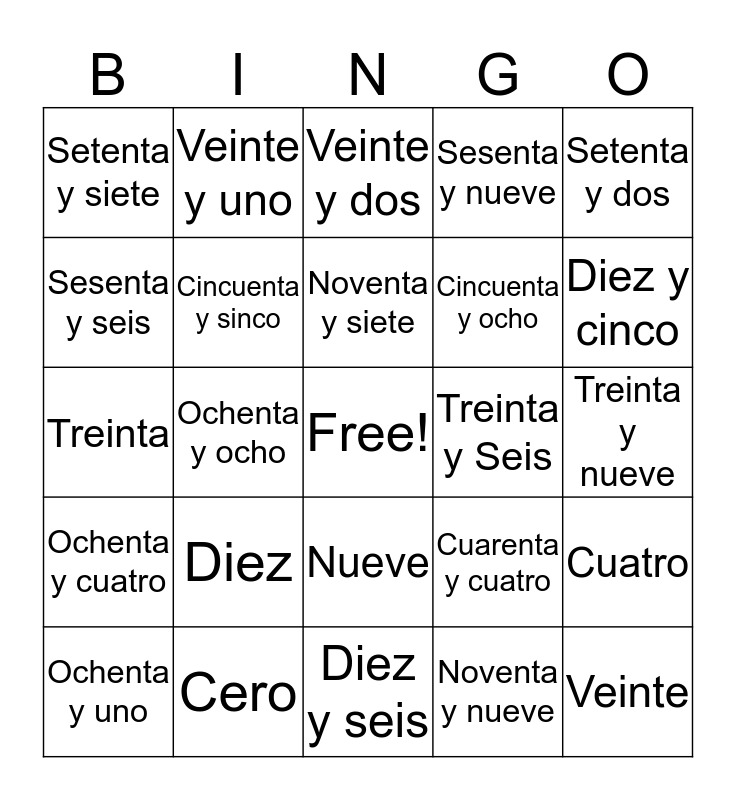 This bingo card has a free space and 24 words: Diez, Cero, Noventa y siete, Ochenta y uno, Setenta y dos, Setenta y siete, Sesenta y seis, Veinte y uno, Treinta y Seis, Nueve, Cincuenta y ocho, Treinta, Cuarenta y cuatro, Cuatro, Cincuenta y sinco, Noventa y nueve, Treinta y nueve, Veinte y dos, Diez y cinco, Ochenta y ocho, Veinte, Ochenta y cuatro, Sesenta y nueve and Diez y seis.