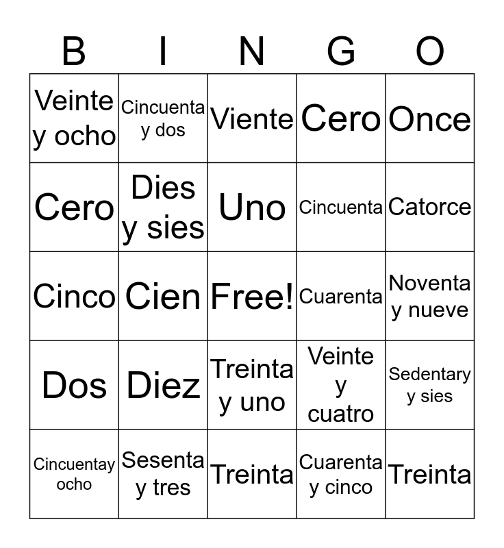 This bingo card has a free space and 24 words: Diez, Sesenta y tres, Uno, Cincuentay ocho, Once, Veinte y ocho, Cero, Cincuenta y dos, Cuarenta, Treinta y uno, Cincuenta, Cinco, Veinte y cuatro, Sedentary y sies, Dies y sies, Cuarenta y cinco, Noventa y nueve, Viente, Catorce, Cien, Treinta, Dos, Cero and Treinta.