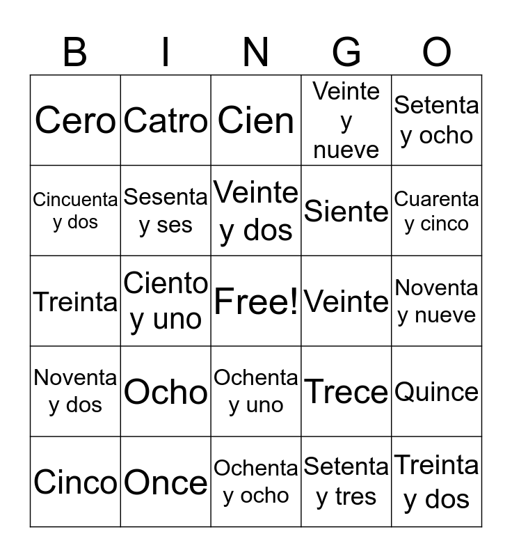 This bingo card has a free space and 24 words: Ocho, Once, Veinte y dos, Cinco, Setenta y ocho, Cero, Cincuenta y dos, Catro, Veinte, Ochenta y uno, Siente, Treinta, Trece, Quince, Sesenta y ses, Setenta y tres, Noventa y nueve, Cien, Cuarenta y cinco, Ciento y uno, Treinta y dos, Noventa y dos, Veinte y nueve and Ochenta y ocho.