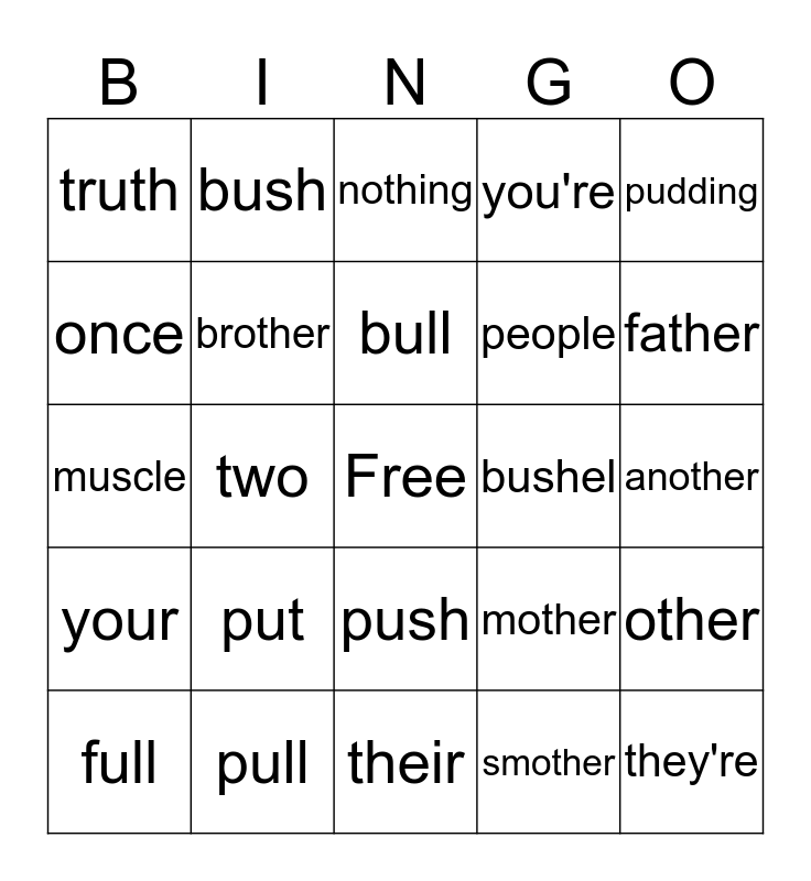 This bingo card has a free space and 24 words: put, pull, bull, full, pudding, truth, once, bush, bushel, push, people, muscle, mother, other, brother, smother, another, nothing, father, two, they're, your, you're and their.
