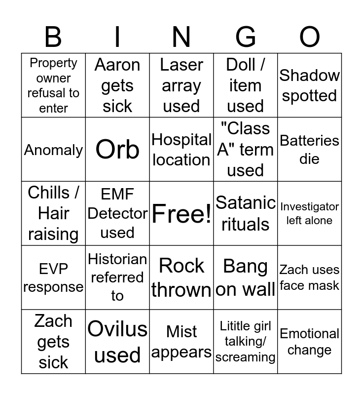 This bingo card has a free space and 34 words: Dude, Lititle girl talking/ screaming, Door closing, Cold air, EVP response, Orb, Shadow spotted, Zach gets sick, Aaron gets sick, Spirit box used, Hospital location, Laser array used, Prison location, House location, Satanic rituals, Batteries die, Ovilus used, Chills / Hair raising, Historian referred to, Bang on wall, Rock thrown, Shake member awake, Property owner refusal to enter, Investigator left alone, Mist appears, Emotional change, Doll / item used, SLS Camera, "Class A" term used, Anomaly, FLIR Camera, EMF Detector used, Zach uses face mask and Nevada location.