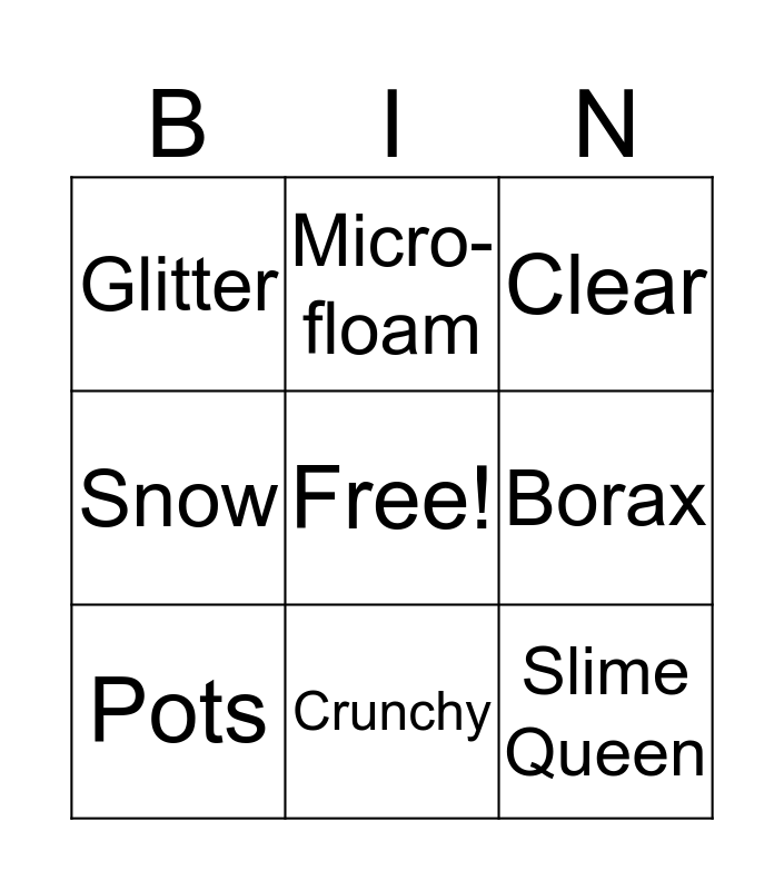 This bingo card has a free space and 11 words: Fluffy, Crunchy, Slime Queen, Pots, Micro-floam, Clear, Borax, Elmers, Snow, Glitter and Glue.