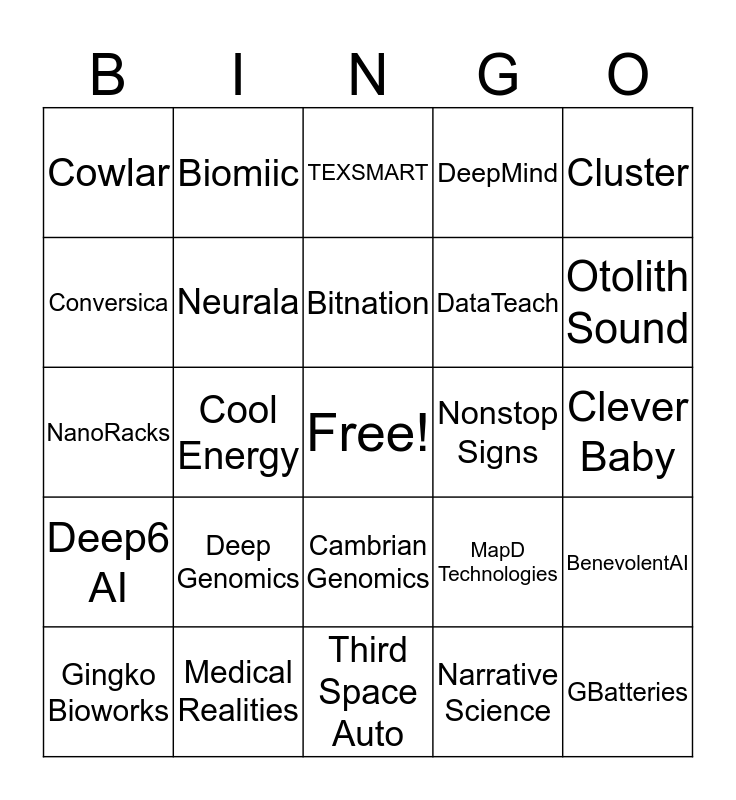 This bingo card has a free space and 66 words: AEternity, Ale, Atomwise, BenevolentAI, Beyond Verbal, BioBots, Biomiic, Biomindr, Bitnation, Blockphase, Cambrian Genomics, Chain of Things, Clever Baby, Cluster, Coakt, Conversica, Cool Energy, Cowlar, CryptoMove, DataTeach, Deep Genomics, Deep6 AI, DeepMind, Desktop Genetics, DFINITY, Elliptic, Equinox Innovative Systems, Flowchain, GBatteries, Genome Compiler, Gingko Bioworks, Grownetics, Inside DNA, Lendy, MapD Technologies, Medical Realities, Muse, NanoRacks, Narrative Science, Neufund, Neurala, Neuralink, Nonstop Signs, Nvidia, OhmConnect, Osso VR, Otolith Sound, Pavlok, Project Nourished, Pycno, rMark Bio, Sekg, Sharecare, Spacee, SpaceX, SQream Technologies, Synbiota, Tesla, TEXSMART, Third Space Auto, Thync, Tokken, Transtutors, Trillium Incorporated, Twenty Billion Neurons and Wyre.