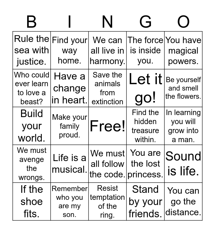 This bingo card has a free space and 24 words: Life is a musical., Remember who you are my son., Save the animals from extinction, If the shoe fits., You have magical powers., Rule the sea with justice., Who could ever learn to love a beast?, Find your way home., Find the hidden treasure within., We must all follow the code., Let it go!, Build your world., You are the lost princess., Sound is life., Have a change in heart., Stand by your friends., In learning you will grow into a man., We can all live in harmony., Be yourself and smell the flowers., Make your family proud., You can go the distance., We must avenge the wrongs., The force is inside you. and Resist temptation of the ring..