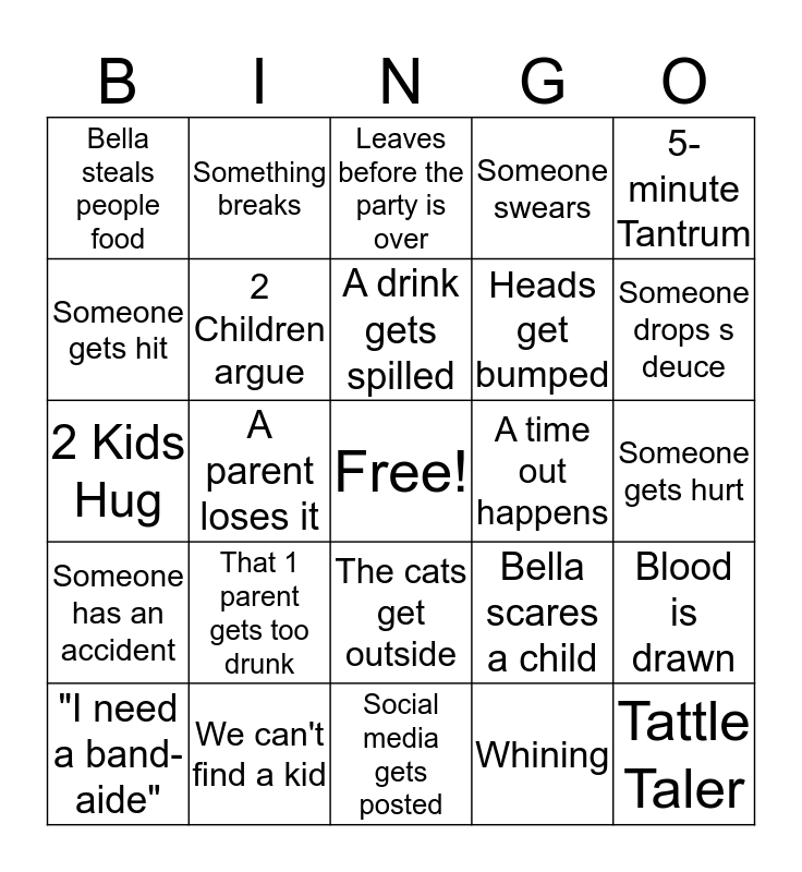 This bingo card has a free space and 24 words: That 1 parent gets too drunk, We can't find a kid, A drink gets spilled, "I need a band-aide", 5-minute Tantrum, Bella steals people food, Someone gets hit, Something breaks, A time out happens, The cats get outside, Heads get bumped, 2 Kids Hug, Bella scares a child, Blood is drawn, 2 Children argue, Whining, Someone gets hurt, Leaves before the party is over, Someone drops s deuce, A parent loses it, Tattle Taler, Someone has an accident, Someone swears and Social media gets posted.