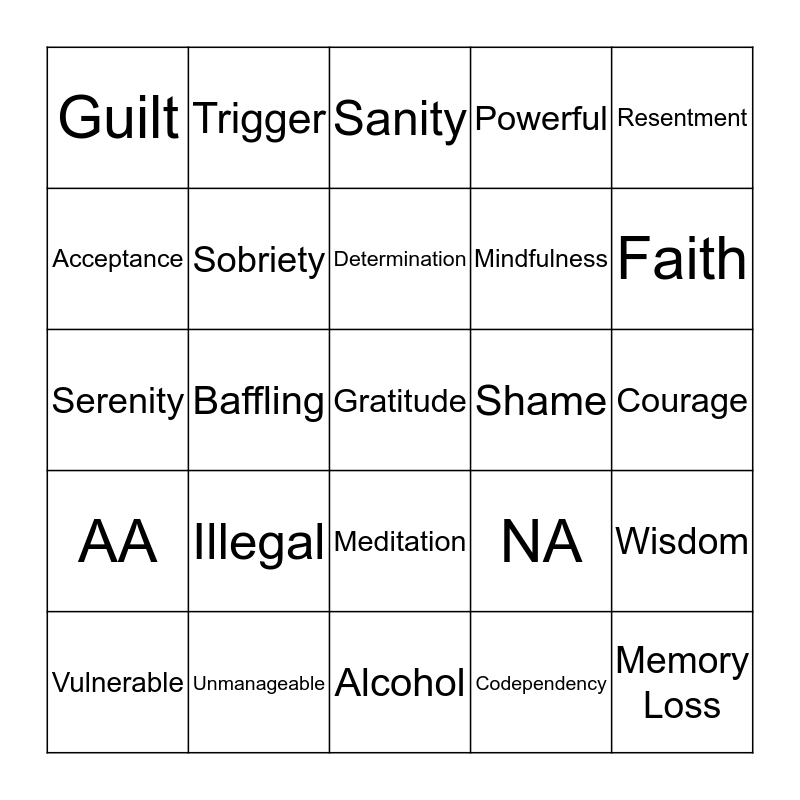 This bingo card has 36 words: Abstinence, Resilience, Therapy, Sobriety, NA, AA, Determination, Depression, Resentment, Craving, Baffling, Powerful, Eustress, Shame, Faith, Guilt, Memory Loss, Illegal, Gratitude, Sanity, Courage, Wisdom, Unmanageable, Vulnerable, Alcohol, Trigger, Serenity, DOC, Mindfulness, Acceptance, 4th Step, Craving, Codependency, Meditation, CBT and Dopamine.
