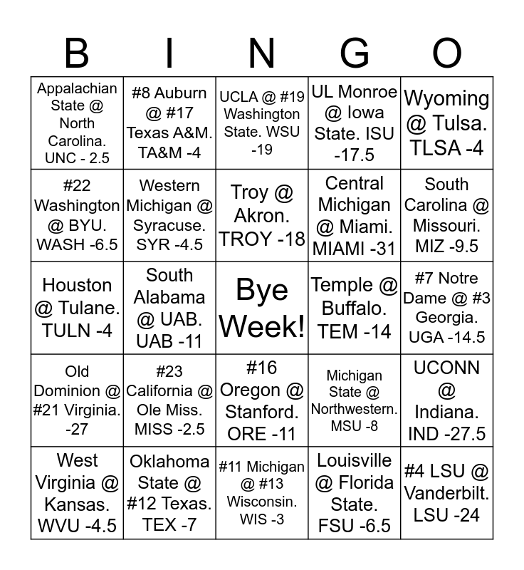 This bingo card has a free space and 48 words: Southern Miss @ #2 Alabama. ALA -38, #4 LSU @ Vanderbilt. LSU -24, Tennessee @ #9 Florida. FLA -13.5, #11 Michigan @ #13 Wisconsin. WIS -3, #23 California @ Ole Miss. MISS -2.5, Miami (OH) @ #6 Ohio State. OSU -39, #8 Auburn @ #17 Texas A&M. TA&M -4, #15 UCF @ Pittsburgh. UCF -10.5, #22 Washington @ BYU. WASH -6.5, SMU @ #25 TCU. TCU -8.5, Western Michigan @ Syracuse. SYR -4.5, UL Monroe @ Iowa State. ISU -17.5, UCONN @ Indiana. IND -27.5, Michigan State @ Northwestern. MSU -8, Coastal Carolina @ UMASS. CCU -16.5, Louisiana @ Ohio. OHIO -3, Troy @ Akron. TROY -18, Temple @ Buffalo. TEM -14, Bowling Green @ Kent State. KENT -12, Wyoming @ Tulsa. TLSA -4, South Alabama @ UAB. UAB -11, Louisville @ Florida State. FSU -6.5, Appalachian State @ North Carolina. UNC - 2.5, Central Michigan @ Miami. MIAMI -31, Kentucky @ Mississippi State. MSST -6.5, South Carolina @ Missouri. MIZ -9.5, West Virginia @ Kansas. WVU -4.5, New Mexico State @ New Mexico. UNM -4, #16 Oregon @ Stanford. ORE -11, Old Dominion @ #21 Virginia. -27, Georgia State @ Texas State. TXST -3, Baylor @ Rice. BAY -26.5, Ball State @ NC State. NCST -19.5, Charlotte @ #1 Clemson. CLEM -41.5, Oklahoma State @ #12 Texas. TEX -7, San Jose State @ Arkansas. ARK -20.5, UTSA @ North Texas. UNT -17.5, #7 Notre Dame @ #3 Georgia. UGA -14.5, Nevada @ UTEP. NEV -14.5, Nebraska @ Illinois. NEB -13, Colorado @ #24 Arizona State. ASU -7.5, Toledo @ Colorado State. TOL -7.5, UCLA @ #19 Washington State. WSU -19, Utah State @ San Diego State. USU -4, Houston @ Tulane. TULN -4, #10 Utah @ USC. UTAH -3.5, Air Force @ #20 Boise State. BSU -7.5 and FIU @ Louisiana Tech. LT -7.