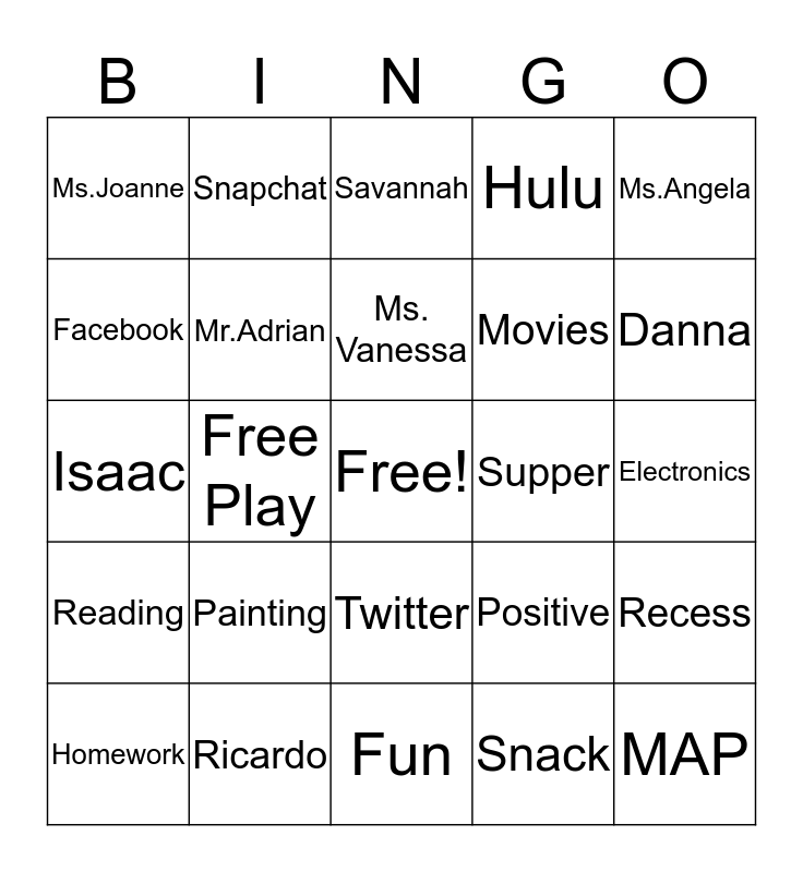 This bingo card has a free space and 29 words: Money, Ricardo, Savannah, Ms.Gabby, Ms.Angela, Ms.Joanne, Mr.Adrian, Ms. Vanessa, Supper, Recess, Homework, Free Play, Snack, MAP, Isaac, Jewels, Fun, Positive, Danna, Reading, Painting, Enrichment, Movies, Electronics, Facebook, Snapchat, Twitter, Hulu and Netflix.