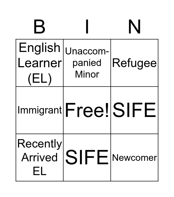 This bingo card has a free space and 8 words: SIFE, Refugee, Unaccom-panied Minor, Recently Arrived EL, English Learner (EL), Newcomer, Immigrant and SIFE.