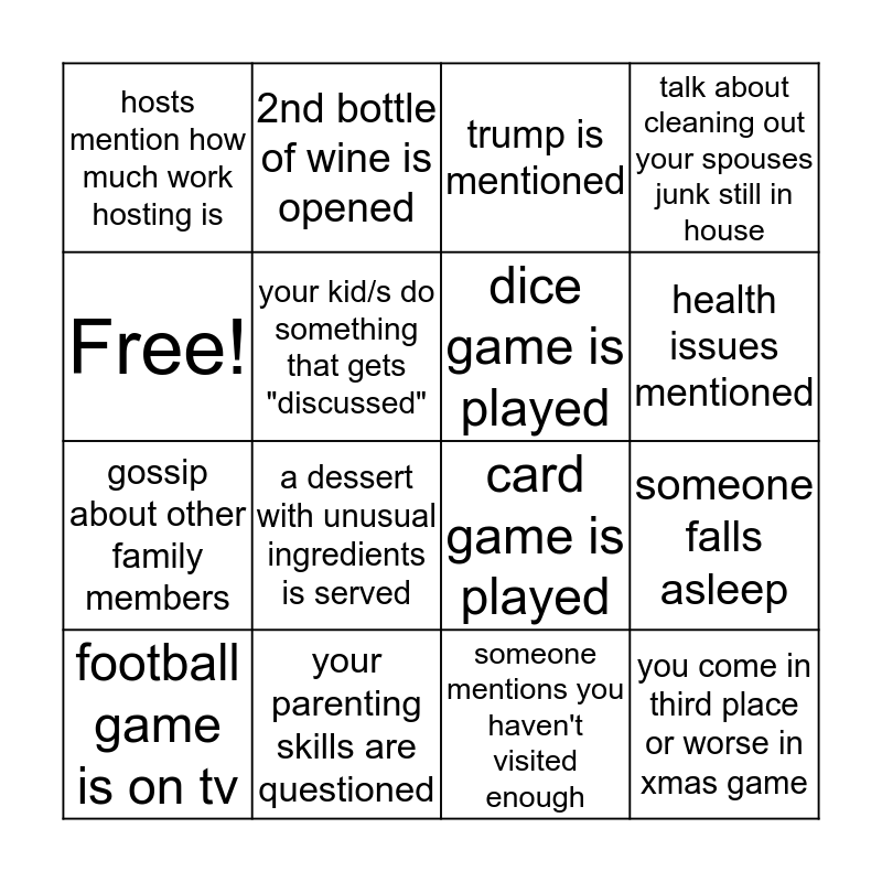 This bingo card has 16 words: your parenting skills are questioned, someone falls asleep, trump is mentioned, hosts mention how much work hosting is, gossip about other family members, 2nd bottle of wine is opened, card game is played, someone mentions you haven't visited enough, Free!, your kid/s do something that gets "discussed", football game is on tv, talk about cleaning out your spouses junk still in house, a dessert with unusual ingredients is served, health issues mentioned, dice game is played and you come in third place or worse in xmas game.