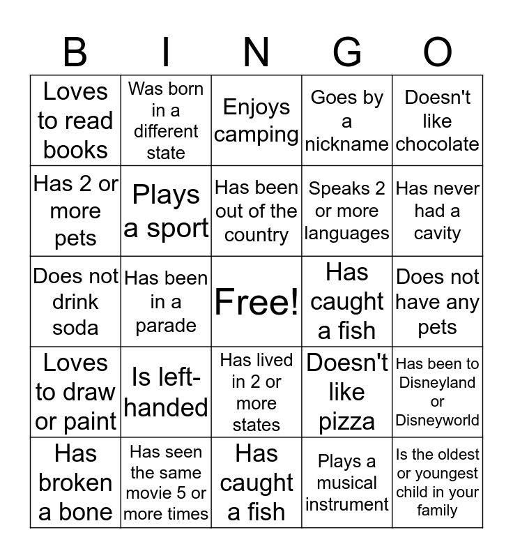 This bingo card has a free space and 24 words: Is left- handed, Has seen the same movie 5 or more times, Has been out of the country, Has broken a bone, Doesn't like chocolate, Loves to read books, Has 2 or more pets, Was born in a different state, Has caught a fish, Has lived in 2 or more states, Speaks 2 or more languages, Does not drink soda, Doesn't like pizza, Has been to Disneyland or Disneyworld, Plays a sport, Plays a musical instrument, Does not have any pets, Enjoys camping, Has never had a cavity, Has been in a parade, Is the oldest or youngest child in your family, Loves to draw or paint, Goes by a nickname and Has caught a fish.