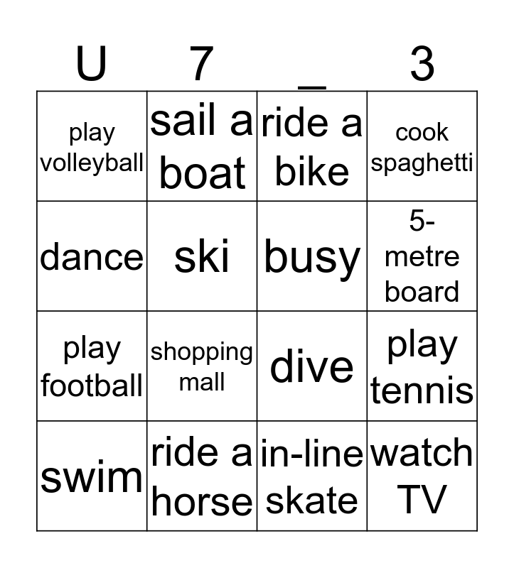 This bingo card has 16 words: ride a horse, play tennis, ride a bike, play volleyball, play football, sail a boat, dive, in-line skate, dance, ski, swim, cook spaghetti, shopping mall, 5-metre board, busy and watch TV.