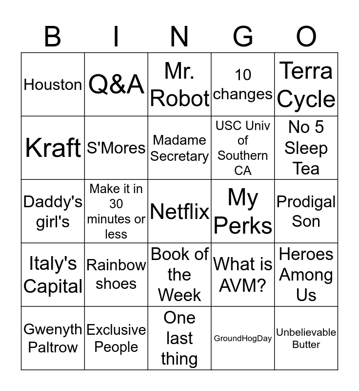 This bingo card has a free space and 24 words: Rainbow shoes, Exclusive People, Madame Secretary, Gwenyth Paltrow, Terra Cycle, Houston, Kraft, Q&A, My Perks, Book of the Week, USC Univ of Southern CA, Daddy's girl's, What is AVM?, Heroes Among Us, S'Mores, GroundHogDay, Prodigal Son, Mr. Robot, No 5 Sleep Tea, Make it in 30 minutes or less, Unbelievable Butter, Italy's Capital, 10 changes and One last thing.