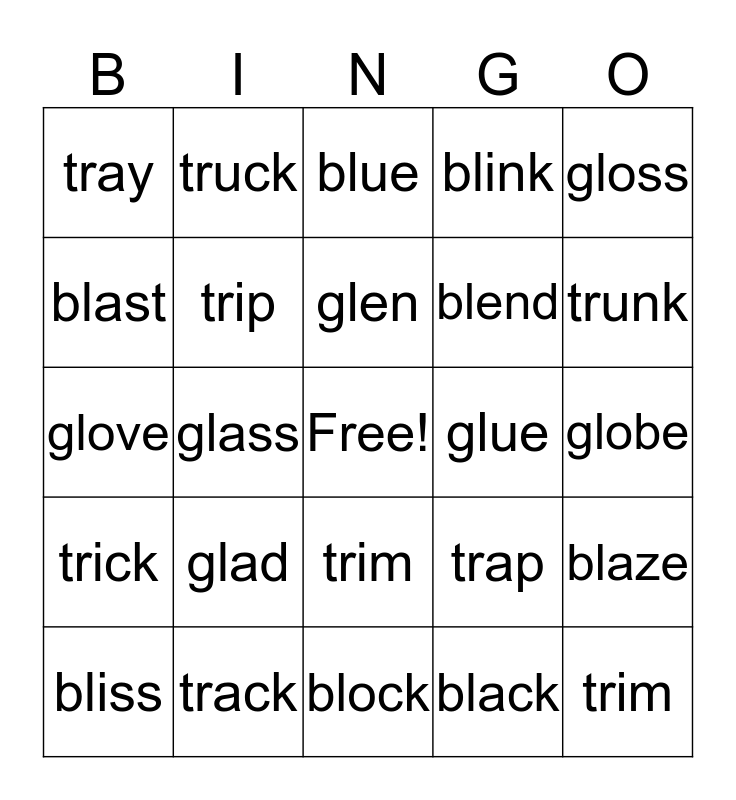 This bingo card has a free space and 24 words: glad, track, glen, bliss, gloss, tray, blast, truck, glue, trim, blend, glove, trap, blaze, trip, black, globe, blue, trunk, glass, trim, trick, blink and block.