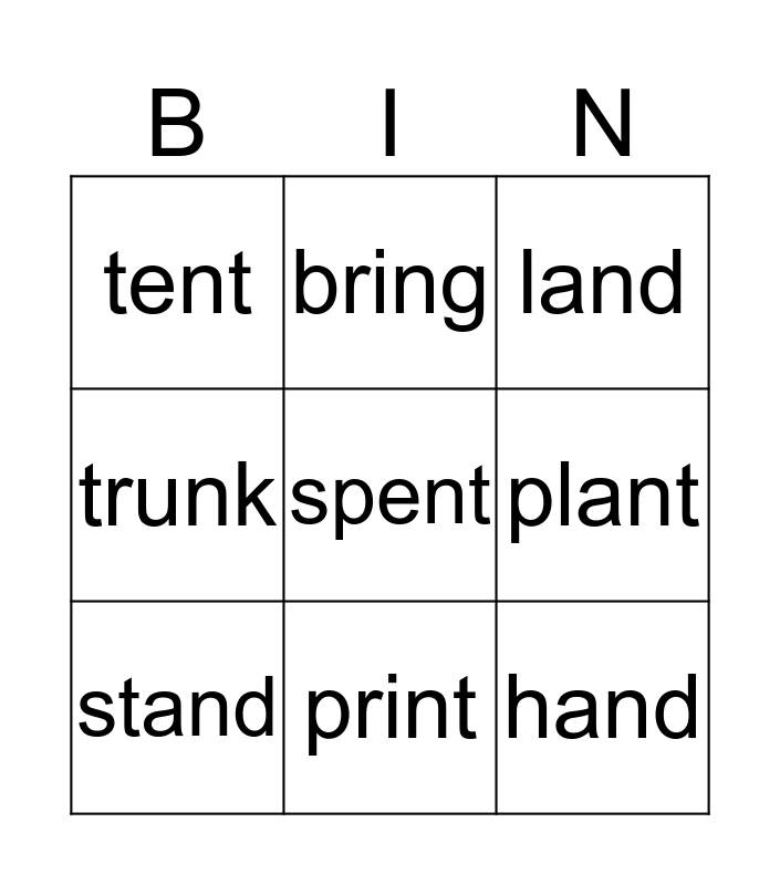 This bingo card has a free space and 15 words: sing, pink, land, tent, print, hand, ring, bank, plant, mend, bang, trunk, stand, bring and drink.