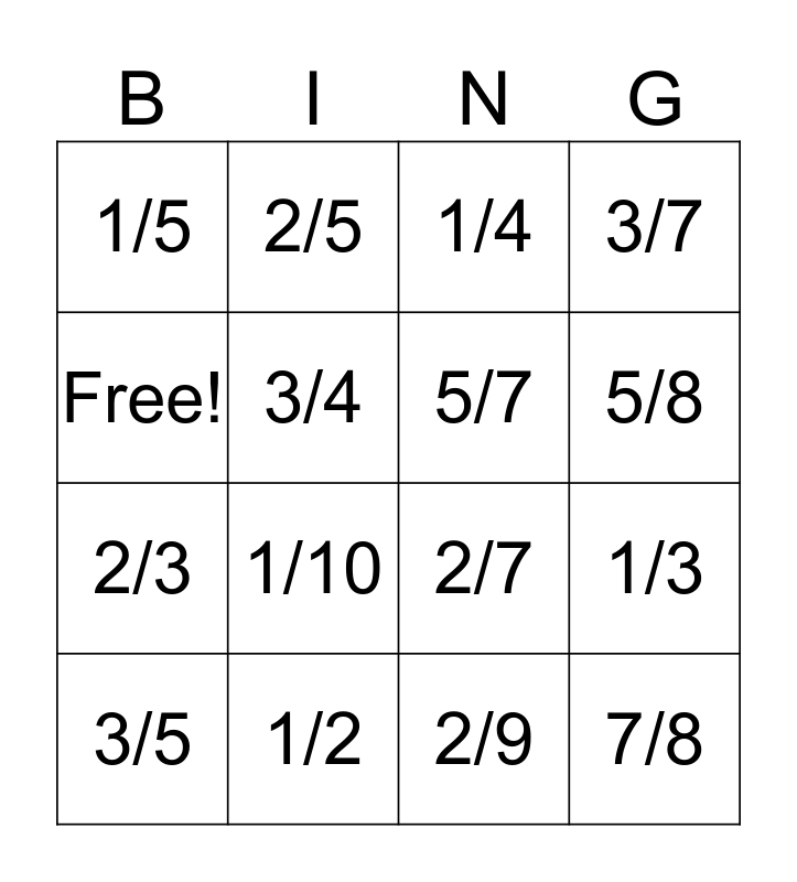 This bingo card has 16 words: 1/2, 1/3, 1/4, 1/5, 2/3, 2/5, 2/7, 2/9, Free!, 3/4, 3/5, 3/7, 1/10, 5/8, 5/7 and 7/8.