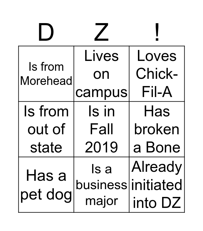 This bingo card has a free space and 8 words: Has broken a Bone, Loves Chick-Fil-A, Lives on campus, Has a pet dog, Is from Morehead, Already initiated into DZ, Is from out of state and Is a business major.