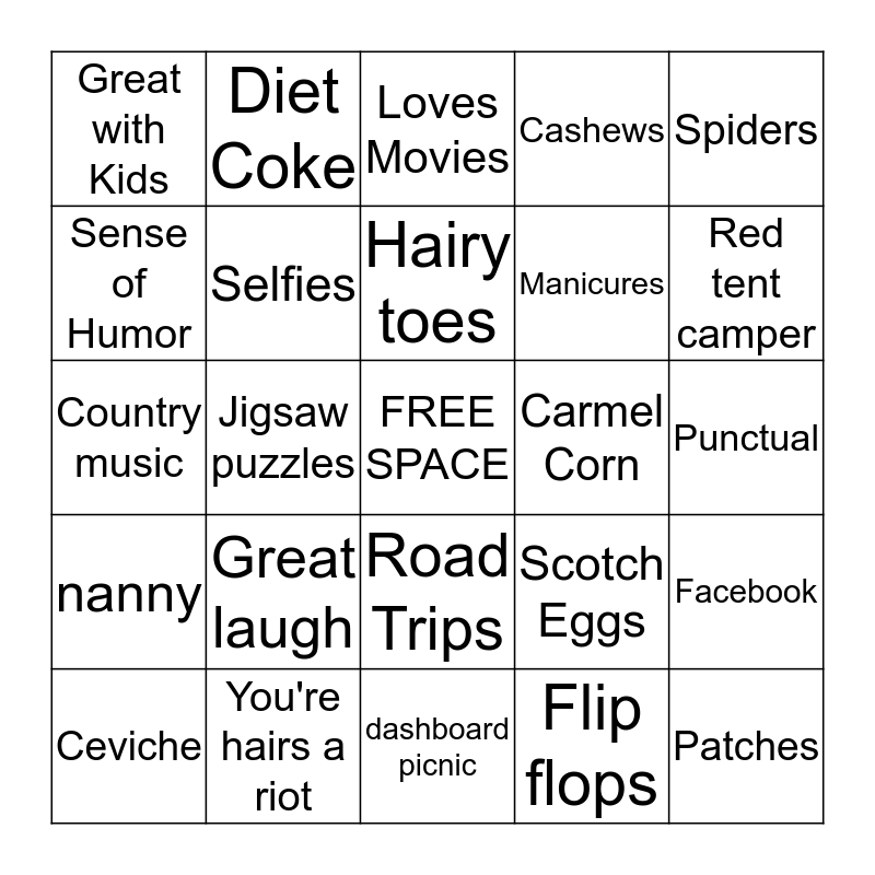 This bingo card has a free space and 24 words: Great laugh, You're hairs a riot, Hairy toes, Ceviche, Spiders, Great with Kids, Sense of Humor, Diet Coke, Carmel Corn, Road Trips, Manicures, Country music, Scotch Eggs, Facebook, Selfies, Flip flops, Punctual, Loves Movies, Red tent camper, Jigsaw puzzles, Patches, nanny, Cashews and dashboard picnic.