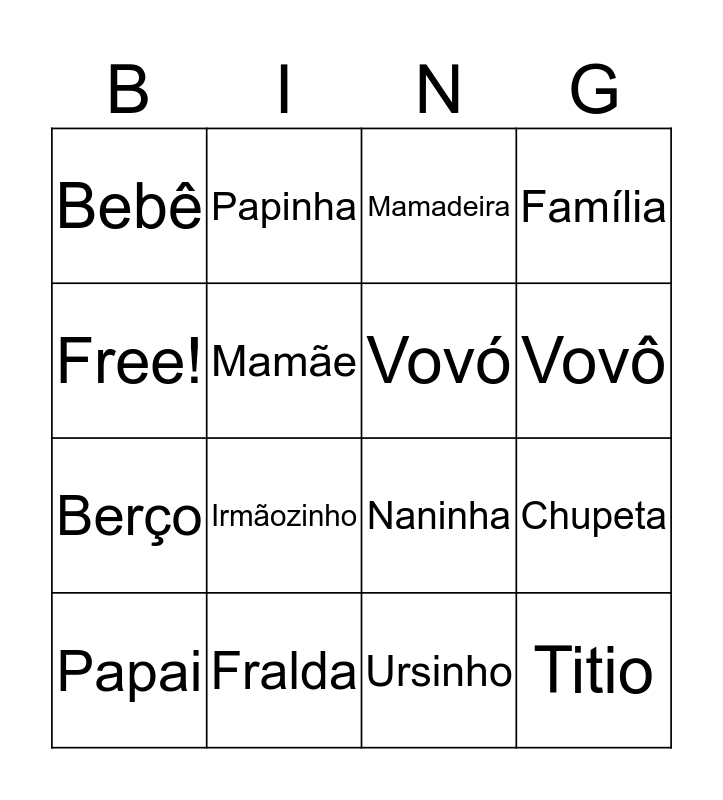 This bingo card has 16 words: Fralda, Chupeta, Mamadeira, Bebê, Berço, Papinha, Naninha, Ursinho, Free!, Mamãe, Papai, Família, Irmãozinho, Vovô, Vovó and Titio.