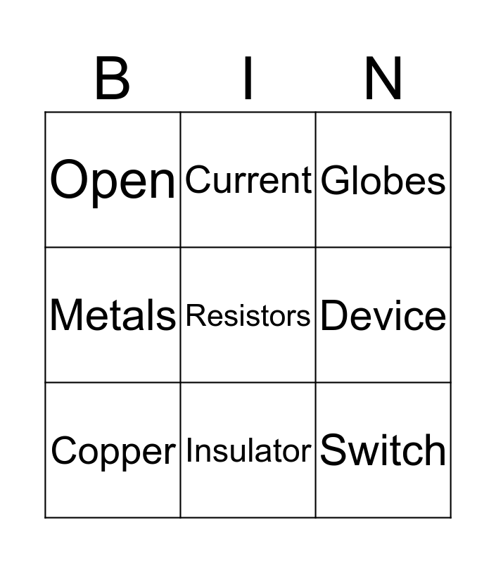 This bingo card has a free space and 20 words: Component, Wires, Globes, Battery, LEDs, Switch, Closed, Open, Electrons, Current, Voltage, Circuit, Device, Power Source, Copper, Conductor, Insulator, Metals, Wood and Ceramic and Electrocution.