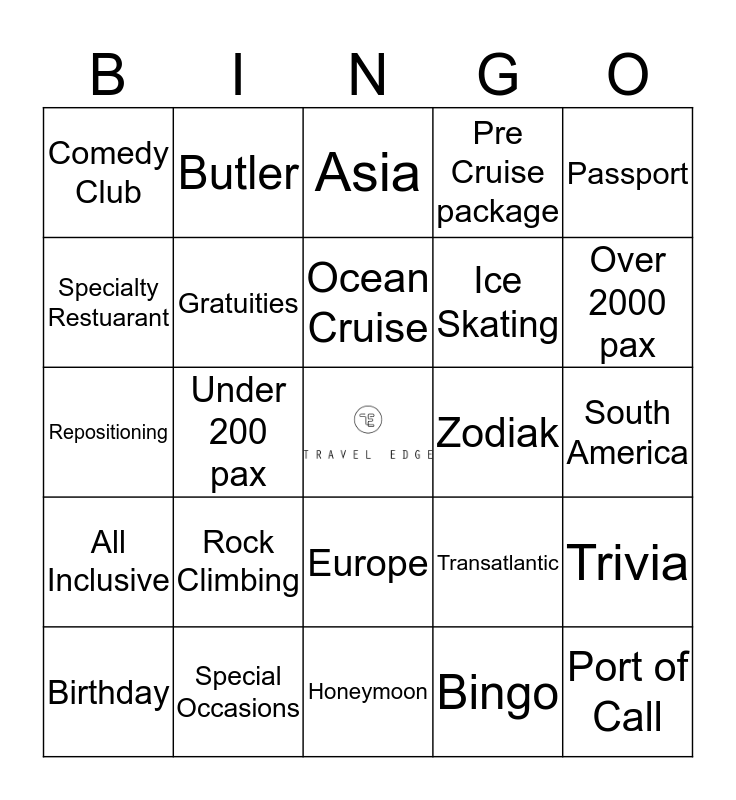 This bingo card has a free space and 42 words: Pool, Ocean Cruise, River Cruise, Rock Climbing, Bingo, Trivia, Port of Call, Bicycles, Asia, Europe, South America, Over 2000 pax, Under 200 pax, Passport, Island, Transatlantic, Transpacific, Repositioning, Towel Animals, Butler, Specialty Restuarant, Dancing, Bars and Lounges, Comedy Club, Rock Climbing, Zip Line, Ice Skating, Low Key, Suite, Verandah, Excursions, All Inclusive, Gratuities, Honeymoon, Anniversary, Birthday, Special Occasions, Zodiak, Butler, Cabin Steward, Pre Cruise package and Post Cruise package.