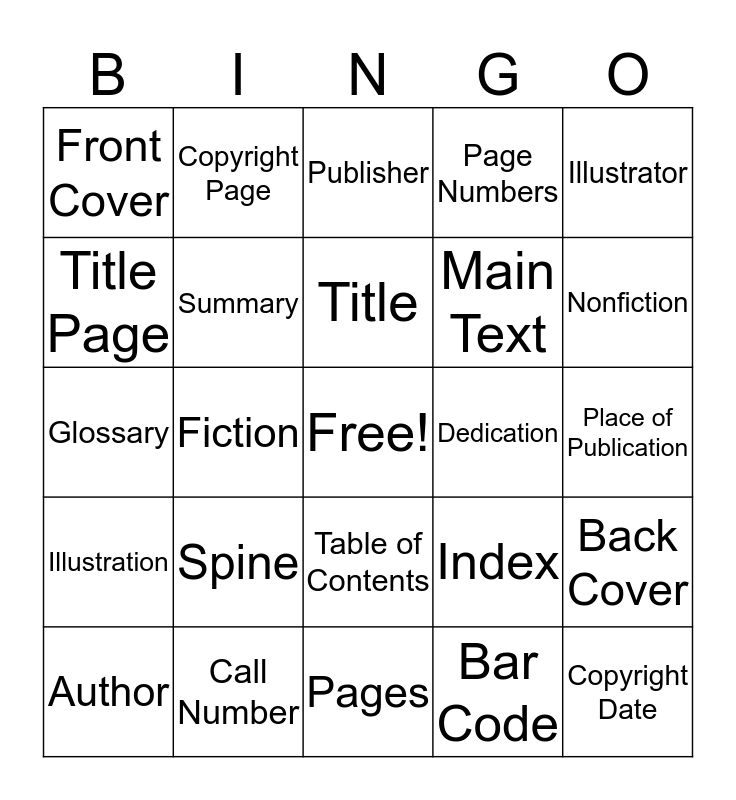 This bingo card has a free space and 24 words: Spine, Call Number, Title, Author, Illustrator, Front Cover, Title Page, Copyright Page, Dedication, Table of Contents, Main Text, Glossary, Index, Back Cover, Summary, Bar Code, Place of Publication, Publisher, Nonfiction, Fiction, Copyright Date, Illustration, Page Numbers and Pages.