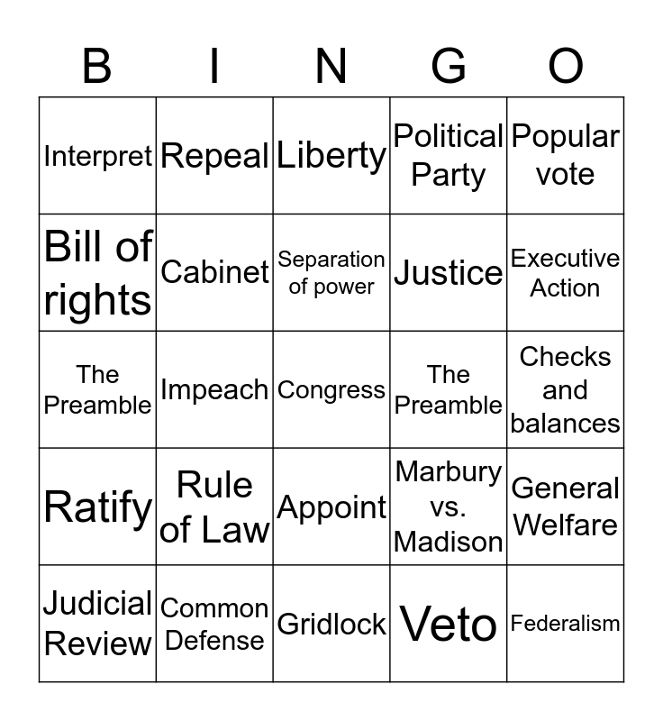 This bingo card has a free space and 24 words: Rule of Law, Common Defense, Separation of power, Judicial Review, Popular vote, Interpret, Bill of rights, Repeal, The Preamble, Appoint, Justice, The Preamble, Marbury vs. Madison, General Welfare, Cabinet, Veto, Checks and balances, Liberty, Executive Action, Impeach, Federalism, Ratify, Political Party and Gridlock.