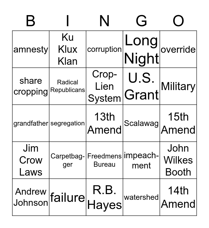 This bingo card has a free space and 39 words: Tuskegee Institute, Reconstruc-tion, Black Codes, Radical Republicans, Andrew Johnson, Freedmens Bureau, Crop- Lien System, 10 % Plan, override, Jim Crow Laws, segregation, Long Night, 14th Amend, 15th Amend, Scalawag, Carpetbag-ger, black peonage, amnesty, ratify, impeach- ment, share cropping, R.B. Hayes, U.S. Grant, Military, Civil Rights Act 1866/67, assass-ination, Civil War Amends., Literacy Tests, Poll Tax, Ku Klux Klan, Moderate, Tilden, corruption, failure, watershed, Amnesty Act, John Wilkes Booth, grandfather and one.