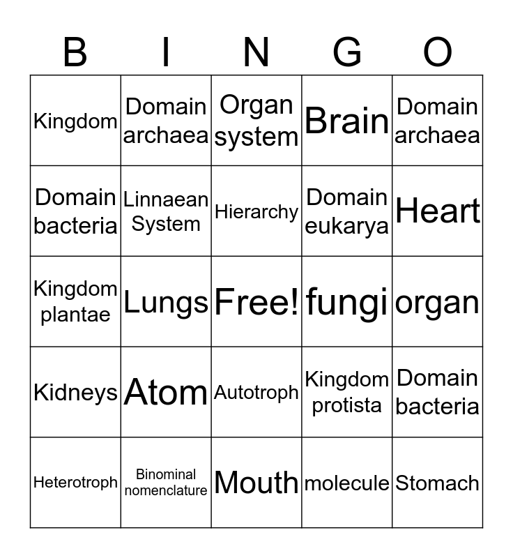 This bingo card has a free space and 24 words: Atom, Binominal nomenclature, Hierarchy, Heterotroph, Domain archaea, Kingdom, Domain bacteria, Domain archaea, fungi, Autotroph, Domain eukarya, Kingdom plantae, Kingdom protista, Domain bacteria, Linnaean System, molecule, organ, Organ system, Heart, Lungs, Stomach, Kidneys, Brain and Mouth.