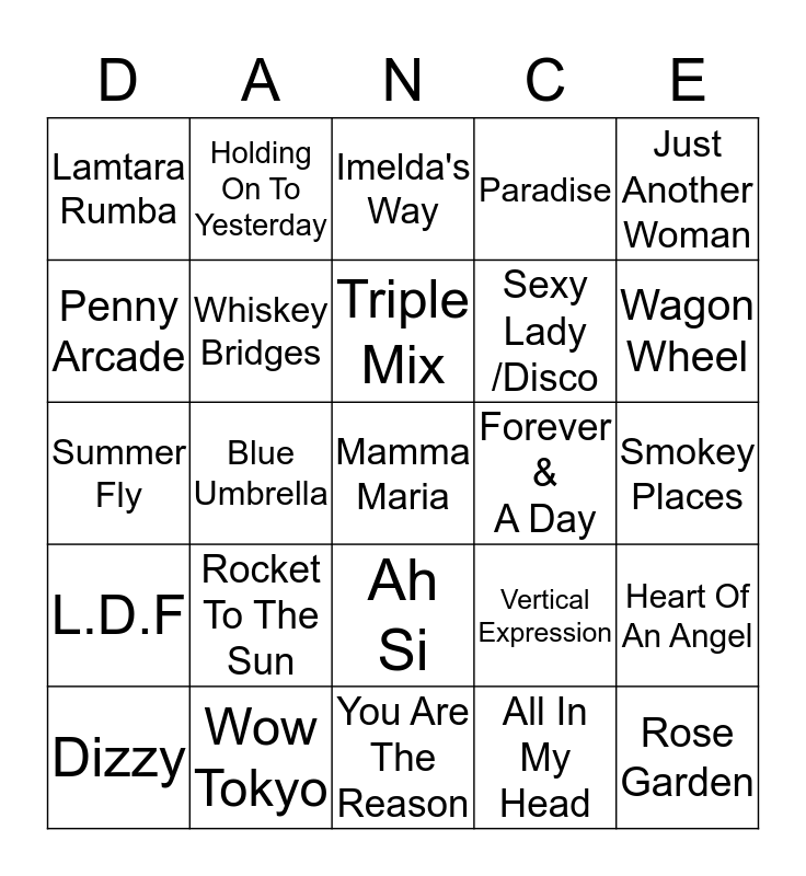 This bingo card has 35 words: Black Coffee, Senorita La La La, Cowboy Strut, Whiskey Bridges, Ah Si, Paradise, Penny Arcade, Could've Been The Whiskey, Triple Mix, The Bomp, Summer Fly, Just Another Woman, Patient Heart, Razor Sharp, Lamtara Rumba, Forever & A Day, All In My Head, Blue Umbrella, L.D.F, Mamma Maria, Vertical Expression, Dizzy, Heart Of An Angel, Wow Tokyo, Imelda's Way, Wagon Wheel, Rose Garden, Jose Cuerveo, Sexy Lady /Disco, Smokey Places, Better When I'm Dancing, You Are The Reason, Rocket To The Sun, Holding On To Yesterday and Chill Factor.