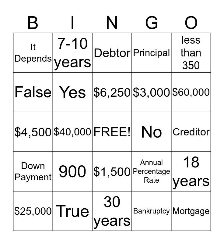 This bingo card has a free space and 24 words: 900, True, $6,250, $25,000, less than 350, It Depends, False, 7-10 years, No, $1,500, $3,000, $4,500, Annual Percentage Rate, 18 years, Yes, Bankruptcy, Creditor, Debtor, $60,000, $40,000, Mortgage, Down Payment, Principal and 30 years.
