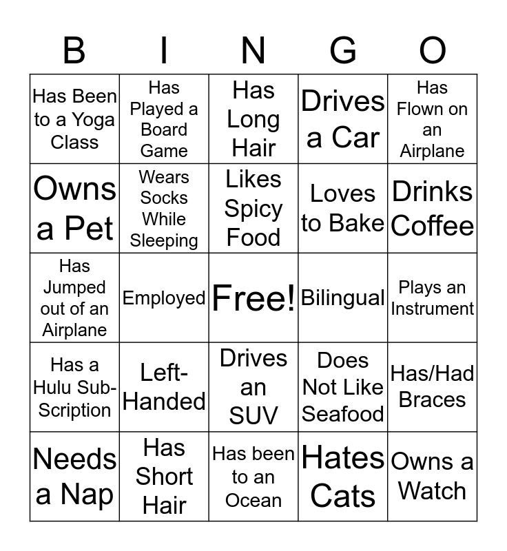 This bingo card has a free space and 24 words: Left-Handed, Has Short Hair, Likes Spicy Food, Needs a Nap, Has Flown on an Airplane, Has Been to a Yoga Class, Owns a Pet, Has Played a Board Game, Bilingual, Drives an SUV, Loves to Bake, Has Jumped out of an Airplane, Does Not Like Seafood, Has/Had Braces, Wears Socks While Sleeping, Hates Cats, Plays an Instrument, Has Long Hair, Drinks Coffee, Employed, Owns a Watch, Has a Hulu Sub- Scription, Drives a Car and Has been to an Ocean.