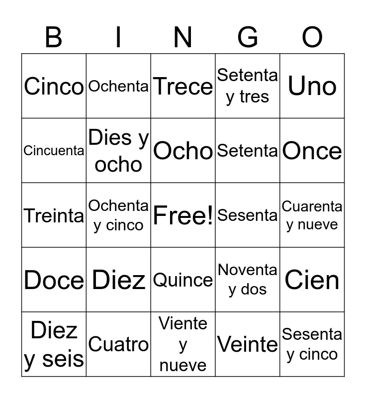 This bingo card has a free space and 24 words: Diez, Cuatro, Ocho, Diez y seis, Uno, Cinco, Cincuenta, Ochenta, Sesenta, Quince, Setenta, Treinta, Noventa y dos, Cien, Dies y ocho, Veinte, Cuarenta y nueve, Trece, Once, Ochenta y cinco, Sesenta y cinco, Doce, Setenta y tres and Viente y nueve.