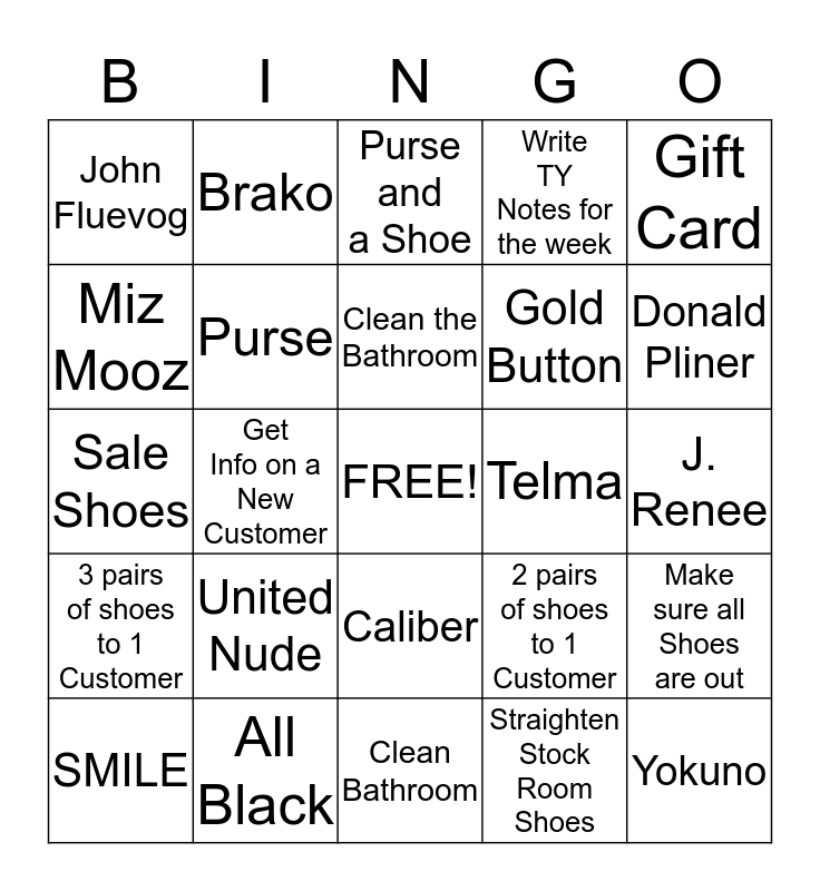 This bingo card has a free space and 24 words: United Nude, All Black, Clean the Bathroom, SMILE, Gift Card, John Fluevog, Miz Mooz, Brako, Telma, Caliber, Gold Button, Sale Shoes, 2 pairs of shoes to 1 Customer, Make sure all Shoes are out, Purse, Straighten Stock Room Shoes, J. Renee, Purse and a Shoe, Donald Pliner, Get Info on a New Customer, Yokuno, 3 pairs of shoes to 1 Customer, Write TY Notes for the week and Clean Bathroom.