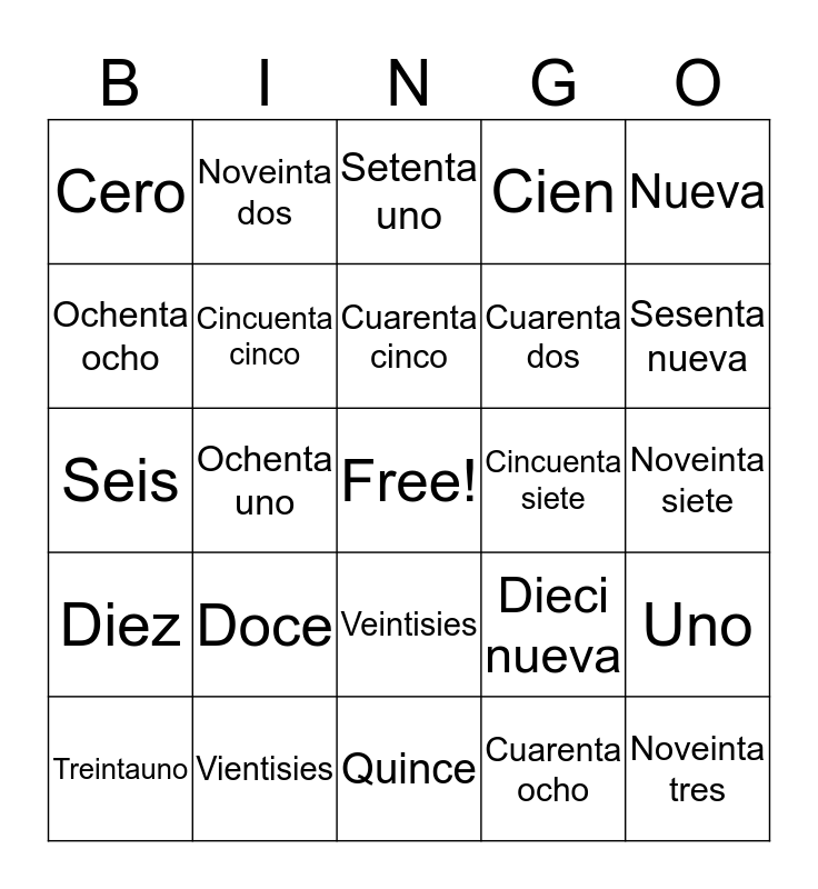 This bingo card has a free space and 24 words: Doce, Vientisies, Cuarenta cinco, Treintauno, Nueva, Cero, Ochenta ocho, Noveinta dos, Cincuenta siete, Veintisies, Cuarenta dos, Seis, Dieci nueva, Uno, Cincuenta cinco, Cuarenta ocho, Noveinta siete, Setenta uno, Sesenta nueva, Ochenta uno, Noveinta tres, Diez, Cien and Quince.