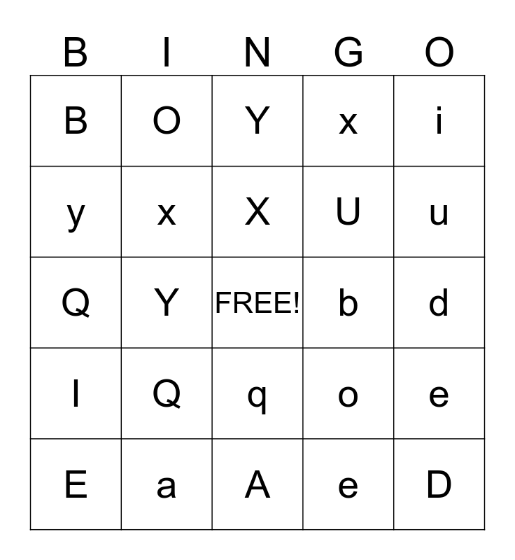 This bingo card has a free space and 24 words: Q, a, X, E, i, B, y, O, b, q, U, Q, o, e, x, e, d, Y, u, Y, D, I, x and A.