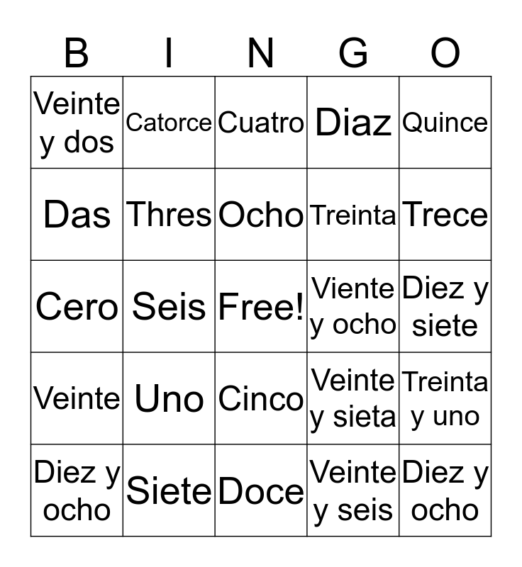 This bingo card has a free space and 24 words: Uno, Siete, Ocho, Diez y ocho, Quince, Veinte y dos, Das, Catorce, Viente y ocho, Cinco, Treinta, Cero, Veinte y sieta, Treinta y uno, Thres, Veinte y seis, Diez y siete, Cuatro, Trece, Seis, Diez y ocho, Veinte, Diaz and Doce.