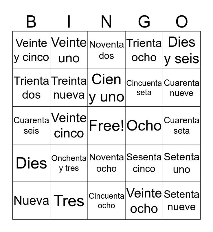 This bingo card has a free space and 24 words: Onchenta y tres, Tres, Cien y uno, Nueva, Dies y seis, Veinte y cinco, Trienta dos, Veinte uno, Ocho, Noventa ocho, Cincuenta seta, Cuarenta seis, Sesenta cinco, Setenta uno, Treinta nueva, Veinte ocho, Cuarenta seta, Noventa dos, Cuarenta nueve, Veinte cinco, Setenta nueve, Dies, Trienta ocho and Cincuenta ocho.