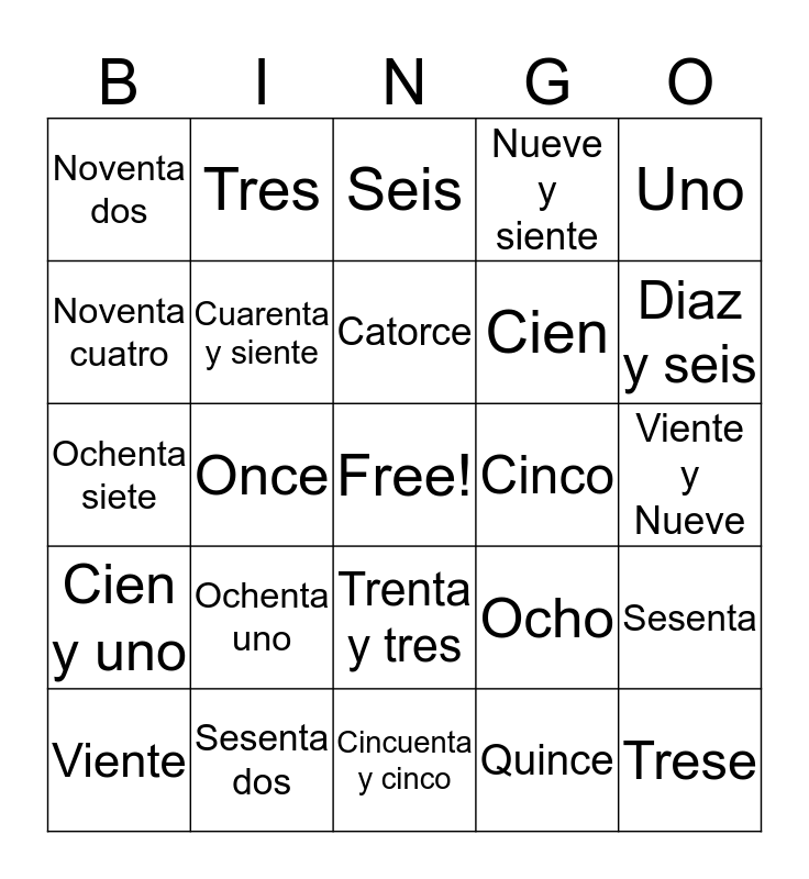 This bingo card has a free space and 24 words: Ochenta uno, Sesenta dos, Catorce, Viente, Uno, Noventa dos, Noventa cuatro, Tres, Cinco, Trenta y tres, Cien, Ochenta siete, Ocho, Sesenta, Cuarenta y siente, Quince, Viente y Nueve, Seis, Diaz y seis, Once, Trese, Cien y uno, Nueve y siente and Cincuenta y cinco.