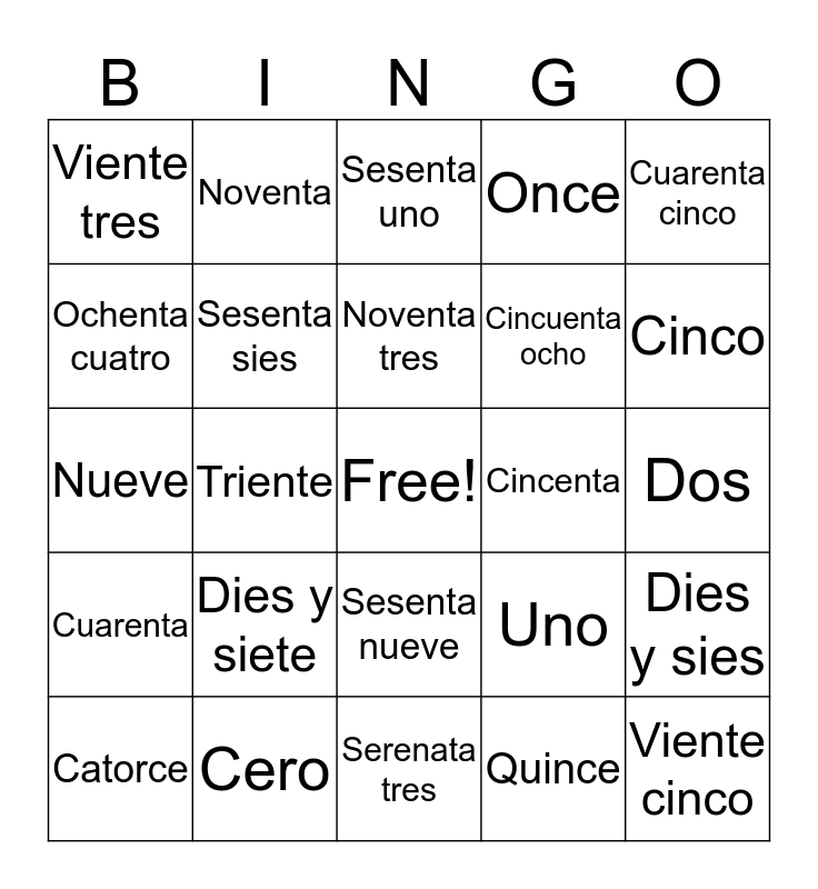 This bingo card has a free space and 24 words: Dies y siete, Cero, Noventa tres, Catorce, Cuarenta cinco, Viente tres, Ochenta cuatro, Noventa, Cincenta, Sesenta nueve, Cincuenta ocho, Nueve, Uno, Dies y sies, Sesenta sies, Quince, Dos, Sesenta uno, Cinco, Triente, Viente cinco, Cuarenta, Once and Serenata tres.