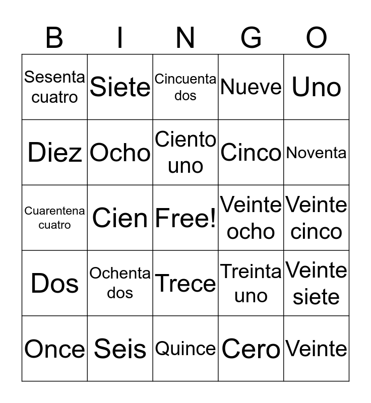 This bingo card has a free space and 24 words: Ochenta dos, Seis, Ciento uno, Once, Uno, Sesenta cuatro, Diez, Siete, Veinte ocho, Trece, Cinco, Cuarentena cuatro, Treinta uno, Veinte siete, Ocho, Cero, Veinte cinco, Cincuenta dos, Noventa, Cien, Veinte, Dos, Nueve and Quince.